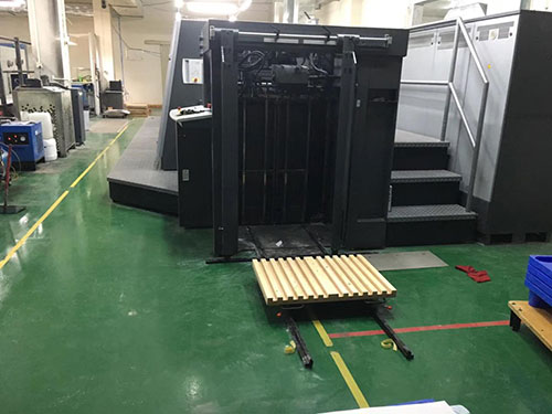 本公司開發生產了一種印刷機預裝紙裝置,適用于國內外各品牌印刷機,用于印刷機進紙的可垂直升降的進紙托盤,其特征在于: 在印刷機進紙托盤上安裝導軌,進紙托盤上導軌與地面安裝的導軌對接,所述導軌和所述進紙托盤之間還設置一個垂直于所述進紙托盤的縱長的定位尺。新型的印刷機預裝紙裝置通過導軌可以精確定位小平板車,再通過定位尺對其上的紙張進行定位,從而快速準確地對小平板車上的紙張進行定位作業。本實用新型的印刷機預裝紙置具有結構簡單,高效,定位準確等優點。
